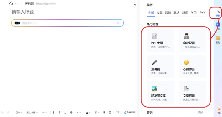 进入写作模块后,可点击“新建文档”,进入写作页面,找到右上角的“模板”按钮,会出现很多可供选择的模板,找到需要的模板类型进行写作。也可直接选择“更多模板”进入模板选择页面。
