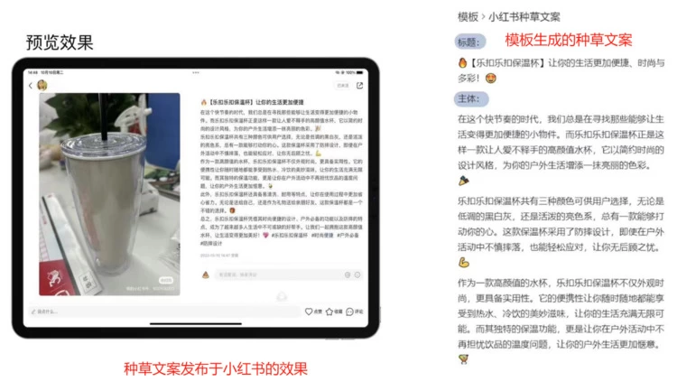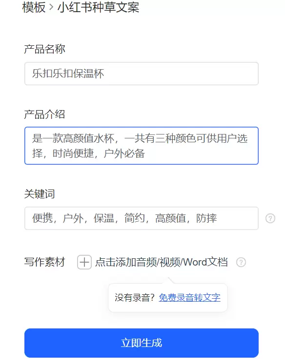 打开小红书种草模板,为保温杯写一篇种草文案,进行产品名称、产品介绍、关键词等信息的输入,即可生成一篇完整的小红书种草文案。