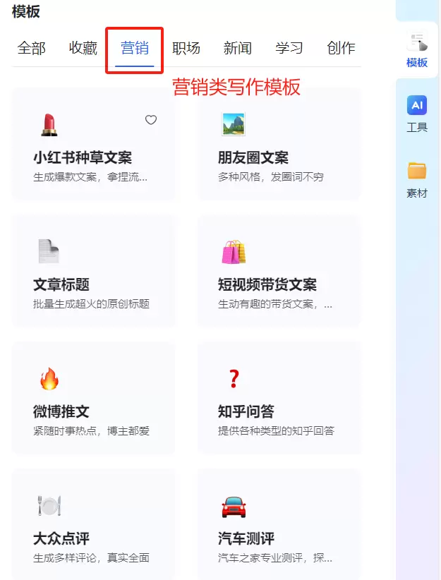 如,营销类写作模板下有小红书种草文案、微博推文、朋友圈文案、汽车测评等不同模板