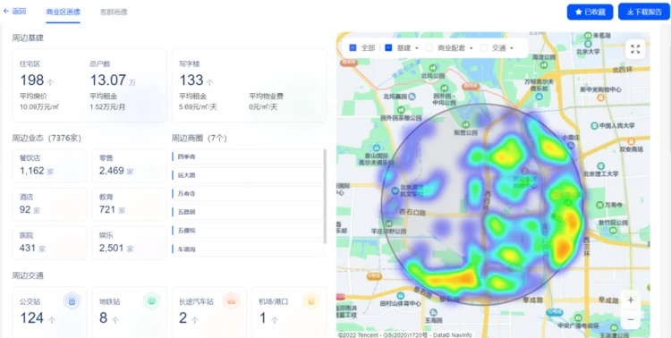 与图在客户圈选区域后,会返回周边区域画像(如小区数量、区域房价、区域业态等)、客群画像(性别比例、年龄分布、美食偏好等)、商业消费画像(如区域内人群的消费力层次、消费趋势等),最终根据全方位数据和信息,建立适合客户业务开展的选址模型,一键生成位置推荐指数,帮助客户实现高效的位置评估决策。