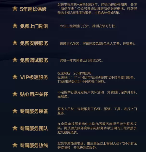海信激光电视拥有超长保修服务标准,屏幕3年保修,主机5年保修。相较市面上其他电视产品,拥有更长的保修时间,免除用户的后顾之忧。安装前的勘测、安装调试等服务也全部免费。所有用户需求均由三星级以上客服人员接待,7*24小时无等待服务。
