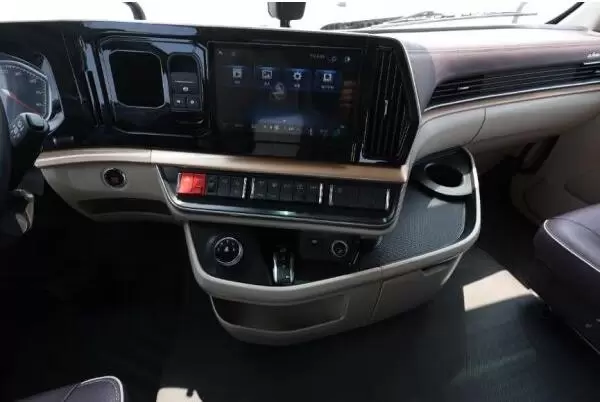 同时,车辆的内饰采用乘用车级别的品质材料,仪表台、门护板、方向盘均使用软质包覆;高端航空座椅用通风加热+按摩,长时间开车不累;抽拉式小桌板、室内晾衣杆、冷暖杯托等贴心设计,功能多样方便日常生活;7寸彩屏+10.1寸液晶大屏,集成手机互联、高清倒车影像、车联网、空调控制调节、蓝牙音乐、电话等功能,工作娱乐两不误。