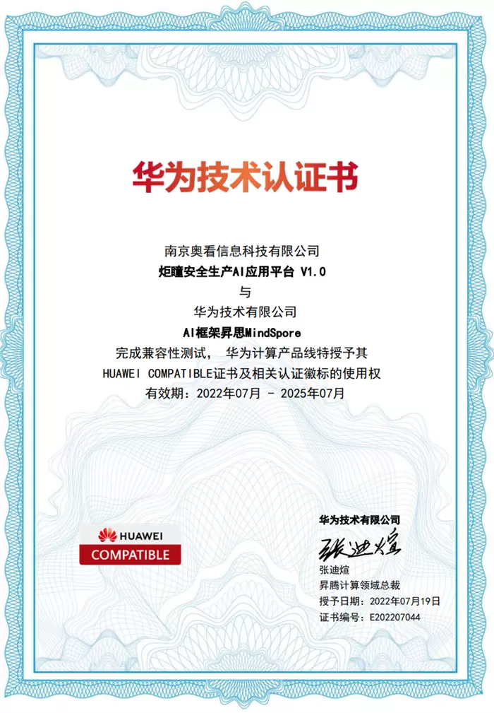 2022年7月,奥看科技凭借炬瞳安全生产AI应用平台,与华为AI框架昇思MindSpore经过性能、功能、安全和兼容性等多维度严格测试,顺利完成兼容性验证工作,荣获华为技术认证书。