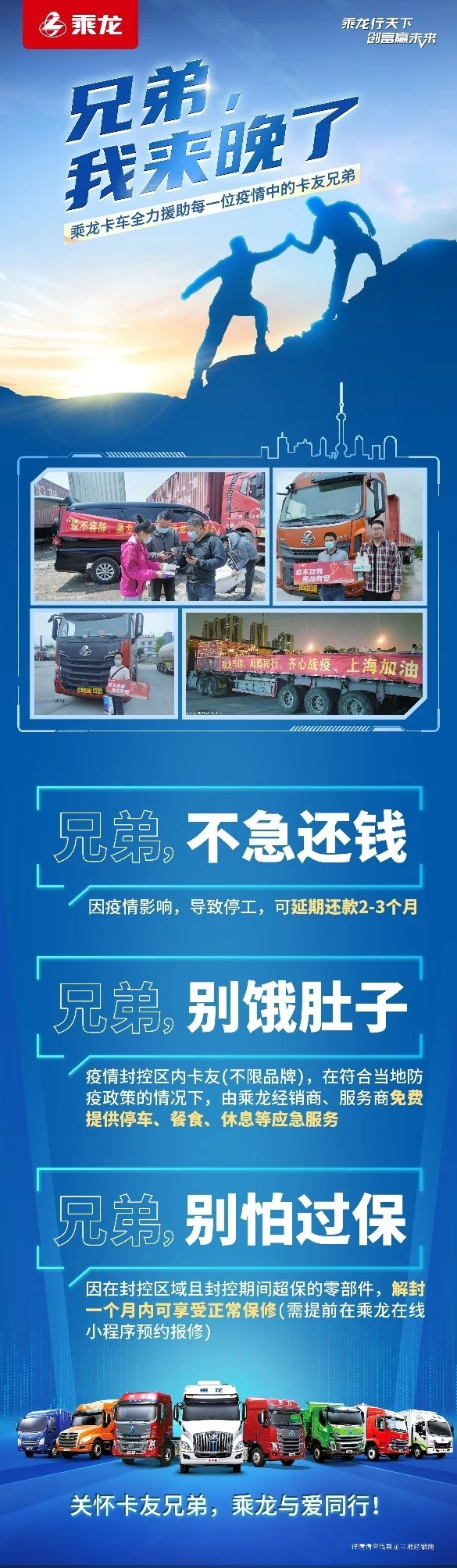 为众人抱薪者,不可使其冻毙于风雪。4月15日,东风柳汽乘龙发起“乘龙有爱,疫路无忧”关怀行动,组织全国范围的经销商与服务商,为受疫情封控影响的乘龙卡友们提供三大关怀服务,确保卡友“不急还钱、别饿肚子、别怕过保”。具体举措包括: