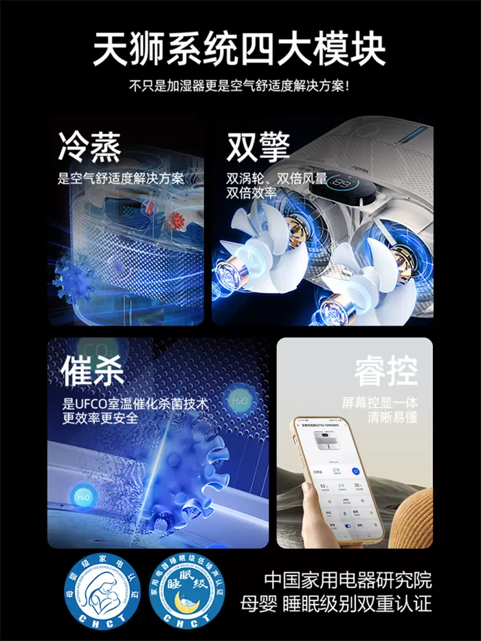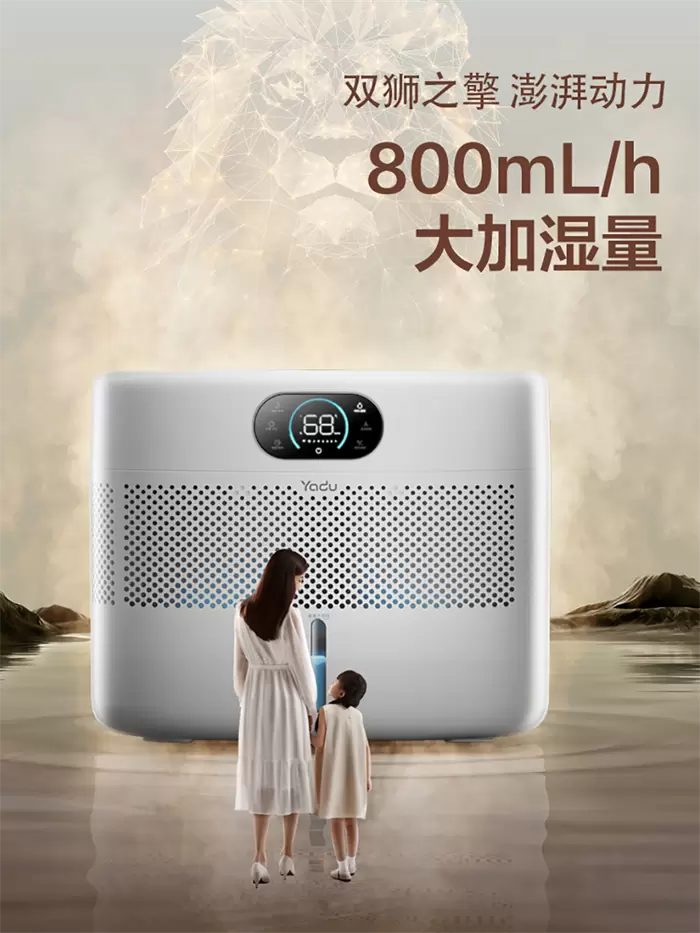 此次全新推出的亚都双擎加湿器最大亮点在于创造性地打造并运用了“天狮系统”。“天狮系统”涵括了冷蒸、双擎、催杀、睿控四大模块。在“天狮系统”的加持下,加湿器以双倍风量加湿,效率加倍,加湿量可达800ml/h,远超行业加湿器加湿量,能在短时间内适宜湿度环境,满足家庭日常加湿需求。