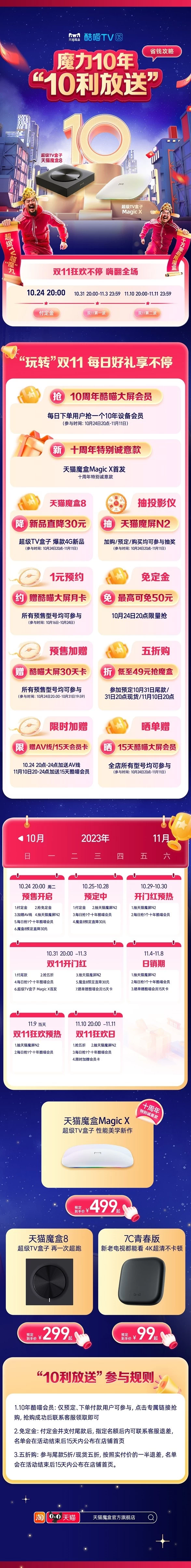 “魔”力十年,10利放送!天猫魔盒&天猫魔屏十周年暨双十一狂欢也正式开启,无论是双十一专享特惠惊喜,还是“传家宝”级终身会员的不二体验,或是天猫魔盒十周年诚意新品超级TV盒子 Magic X,这次天猫魔盒&天猫魔屏“屏”实力,成为你的天作之“盒”!