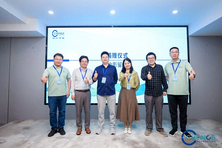 达坦科技联合创始人王璞(右2)、武汉简视科技有限公司总经理宋君(右3)、上海交通大学重庆人工智能研究院院长助理刘伟(左3)参与开源项目捐赠仪式