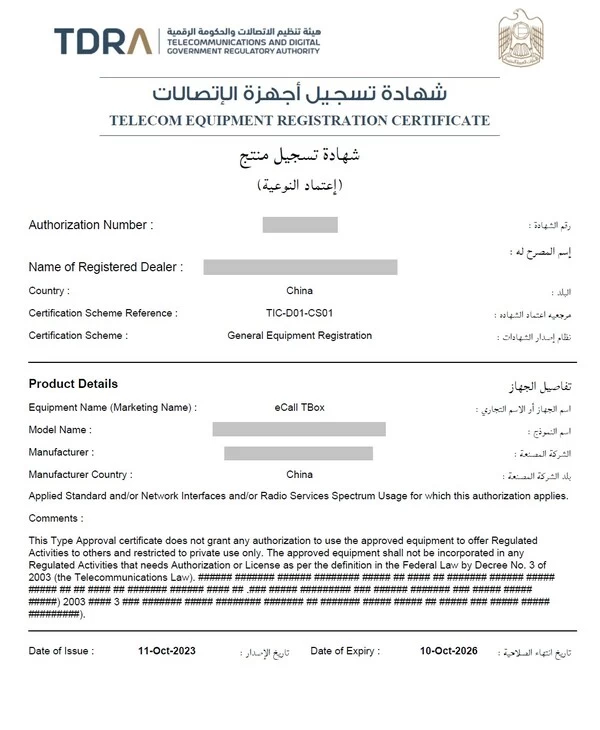 近日,国际独立第三方检测、检验和认证机构德国莱茵TÜV集团(以下简称"TÜV莱茵")依据阿联酋最新规定,助力慧翰微电子股份有限公司(简称"慧翰")、东软集团股份有限公司(简称"东软")和杭州云动智能汽车技术有限公司(简称"云动智能")完成TDRA认证"3.0新规"下的全球首批测试,并顺利获得了阿联酋电信和数字政府管理局(Telecommunications and Digital Government Regulatory Authority, TDRA)颁发的eCall证书,突显了TÜV莱茵对包括阿拉伯联合酋长国的海外市场情况、各国准入门槛的了解以及对可靠的的第一手信息的掌握,能为"中国智造"成功迈向国际舞台提供有力支撑。