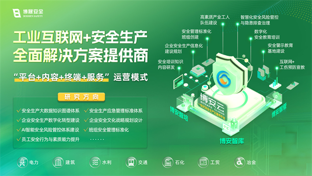 公司凭借长期积淀的专业研究和技术创新能力,打造了一站式安全生产云服务平台“博安云”,以博安智库为核心支撑,深入探索研究安全生产大数据知识图谱体系、安全生产应急管理标准体系、企业安全生产数字化转型建设、企业安全文化战略规划设计、AI智能安全风险管控体系建设、班组安全管理标准化、员工安全行为与素质能力提升等专业方向,融合智库应用、平台服务、产品技术创新于一体,依托“平台+内容+终端+服务”一体化运营模式,为企业、政府部门、中介机构、从业人员、高等学校等服务对象提供行业领先的安全生产全面解决方案。