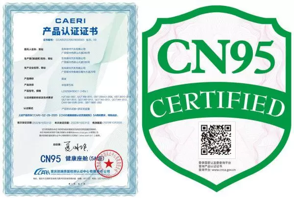 完成全部五项健康座舱认证,五项全部达A等级授予“CN95健康座舱5A级”证书及相应的认证标志(仅5A级拥有认证标志)