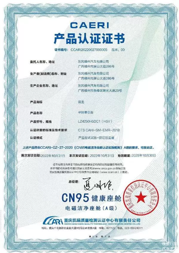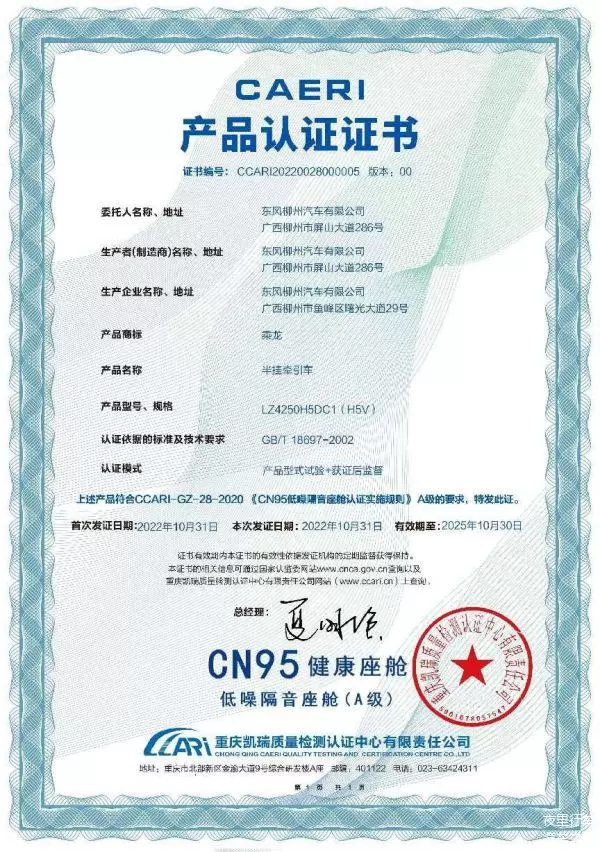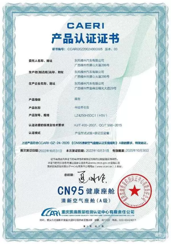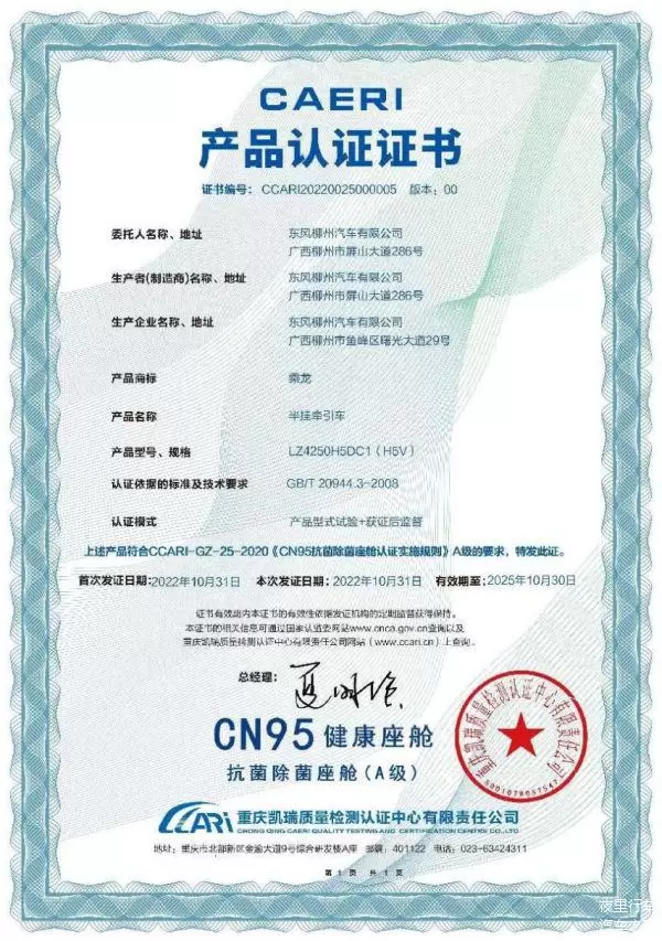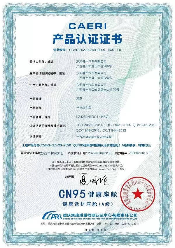 作为有责任、有担当的商用车制造企业,东风柳汽乘龙一直走在守护卡车司机的最前沿。近期亮相的乘龙H5V,通过了国内权威机构—中国汽研凯瑞认证,获得了 “CN95健康座舱” 5个维度测评全部“5A”级最佳水平的认证证书及认证标识,以更加绿色、健康的驾乘体验,引领卡车司机健康工作新方向。
