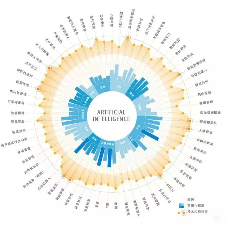 根据上述六重含义,有专业人士对人工智能在13个行业、61项技术应用进行了梳理,主要从“商业化程度”和“技术应用深度”两个维度进行了研究,如下图所示: