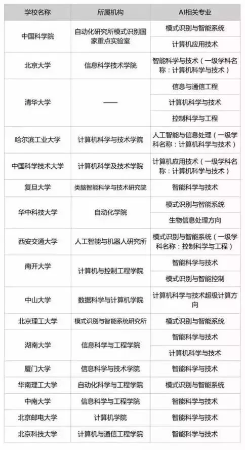 在国家鼓励和业界需求的影响下,截止2018年7月,国内高校已经成立了近20所人工智能学院、研究所等机构。早在2017年5月份,刚刚成立的中国科学院大学就成立了人工智能技术学院,这也是我国第一所进行人工智能教学和科研的学院。此后,中山大学、南京大学、西安电子科技大学、南开大学、上海交通大学、吉林大学、天津大学、哈尔滨工业大学等学校相继成立人工智能学院。而在2018年6月28日,清华大学也宣布成立人工智能研究院。