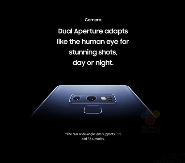 在拍照方面,Galaxy Note9 的后置双摄模组延续了 Galaxy S9 的机械式可变光圈,将支持 F1.5 和 F2.4 的智能切换。此外,该机也将加入目前 Android 手机之中常见的 "AI 相机 " 功能,并具备 AI 场景识别能力,能够自动调整照片色彩和对比度等参数。