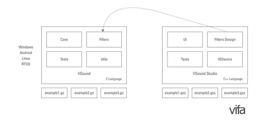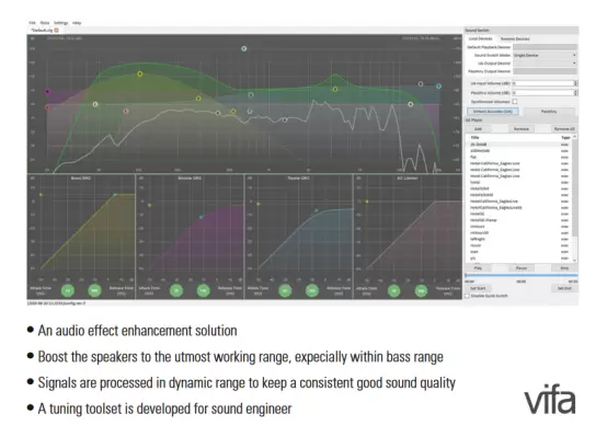 处理音乐信号的运算平台是多样化的,可基于Linux、windows系统层,或基于MCU、专用DSP、ARM处理器等,在进行方案配置时需要做多平台的移植和适配工作。为使算法在各平台都具备统一的Vifa调校标准,Vifa声学研究院为此自研VSound Studio音效平台工具,融合常规音频处理、自研音效、信号仿真、声学测试等多重模块。声学工程师利用平台进行直观的调音和效果验证,亦是为了能够高效、灵活地适配客户的声音需求所进行的一系列开发部署。