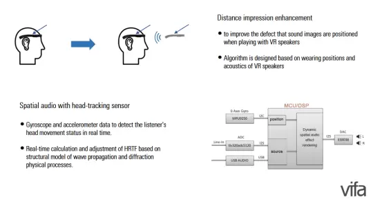 在耳机和VR设备应用领域,高还原度与沉浸感对音效也提出了更高要求。如扬声器置于耳后时,后置的声像体验感欠佳,而声像前置算法能虚拟出前置听感的声像,直观改善体验;动态声像追踪算法对信号进行动态处理,使声像实时保持在精准方位,对VR游戏视界中移动发声体的交互体验有决定性提升。
