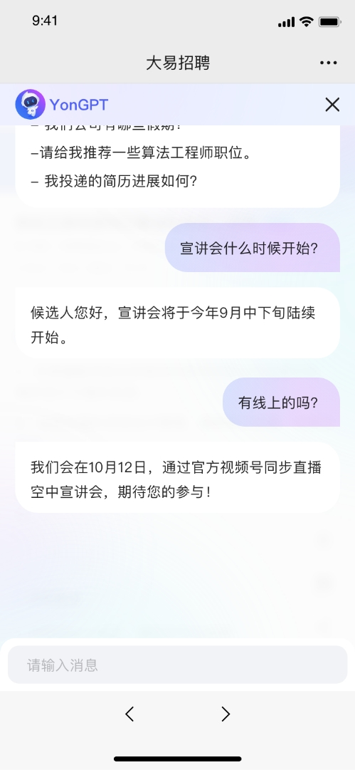 用友大易招聘客服机器人基于企业服务大模型YonGPT,实现了全新升级,在生成式AI技术的加持下,具备敏而好学、面面俱到、灵活对答、察言观色的优秀品质,更智能、更贴心地与求职者进行在线互动。