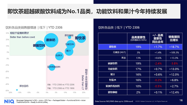 疫情后受线下人流回升和即时性需求回暖的驱动,今年饮料品类整体销售额有所回升。气泡图中列出尼尔森IQ所监测的几大的饮料品类显示,横轴是YTD 23年6月 vs YTD22年6月增速,纵轴是YTD23年6月VS YTD19年6月的增速,越靠近右上角品类表现越好。纵观以下饮料市场细分品类,即饮茶趋于成为第一大饮料细分品类,YTD 23年6月即饮茶品类重要性与销售额增速均居各大饮料细分品类榜首,无糖即饮茶是即饮茶销售增长的主要推手。功能饮料、果汁持续保持增长热度,碳酸饮料受无糖碳酸增长影响,销售额增长较去年同期呈现疲软态势,在饮料市场细分品类规模中排名第二。