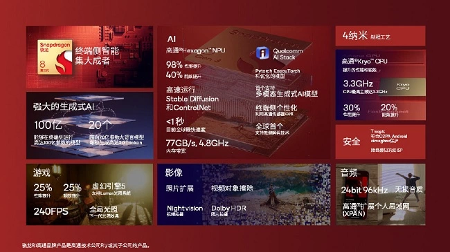 真我GT5 Pro搭载的骁龙8Gen3旗舰芯片对比上一代,性能表现显著提升,是目前为止性能最强的骁龙5G处理器。它采用台积电4nm工艺制造,1+5+2的CPU核心架构,即由1个高性能的Cortex-X4超大核、5个A720性能核心和2个A520的能效核心组成,其中超大核主频最高可达3.3GHz。相比上一代产品,第三代骁龙 8 的CPU性能提升了30%,能效提升了20%。再加上真我GT系列一贯以来对性能的极致调校,相信一定会带来超越期待的性能体验。