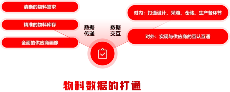 因此,想要实现供应链的数字化,物料数据的打通是关键。王良指出,只有在物料数据打通的情况下,企业才能明确物料需求、精准的物料库存、全面的供应商画像。而物料数据的打通包含两层含义:一个是对内打通,打通设计、采购、仓储、生产各环节;对外则是实现与供应商的互认互通。只有实现了物料数据在供应链各环节的标准打通,才能清晰了解物料采购需求,精准的匹配物料库存,全面的掌握供应商情况,进而真正实现供应链数字化转型。