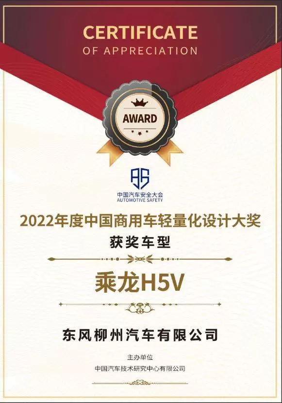 在本届中国汽车安全大会上,中国汽车技术研究中心联合行业权威机构、高校等技术力量,共同打造了先进车身技术与发展趋势交流论坛、先进底盘技术与发展趋势交流论坛与主被动安全技术研究等三个主题论坛。同时,大会还组成了以国内外顶级专家、教授领衔的车辆评估团队,对2022年中国汽车行业涌现的新产品进行点评。经过专家团队谨慎评议,通过“新材料、新结构、新工艺、拓扑优化、功能集成”五大轻量化技术应用实现底盘降重200-300kg的乘龙H5V荣获“2022年度中国商用车轻量化设计大奖”。
