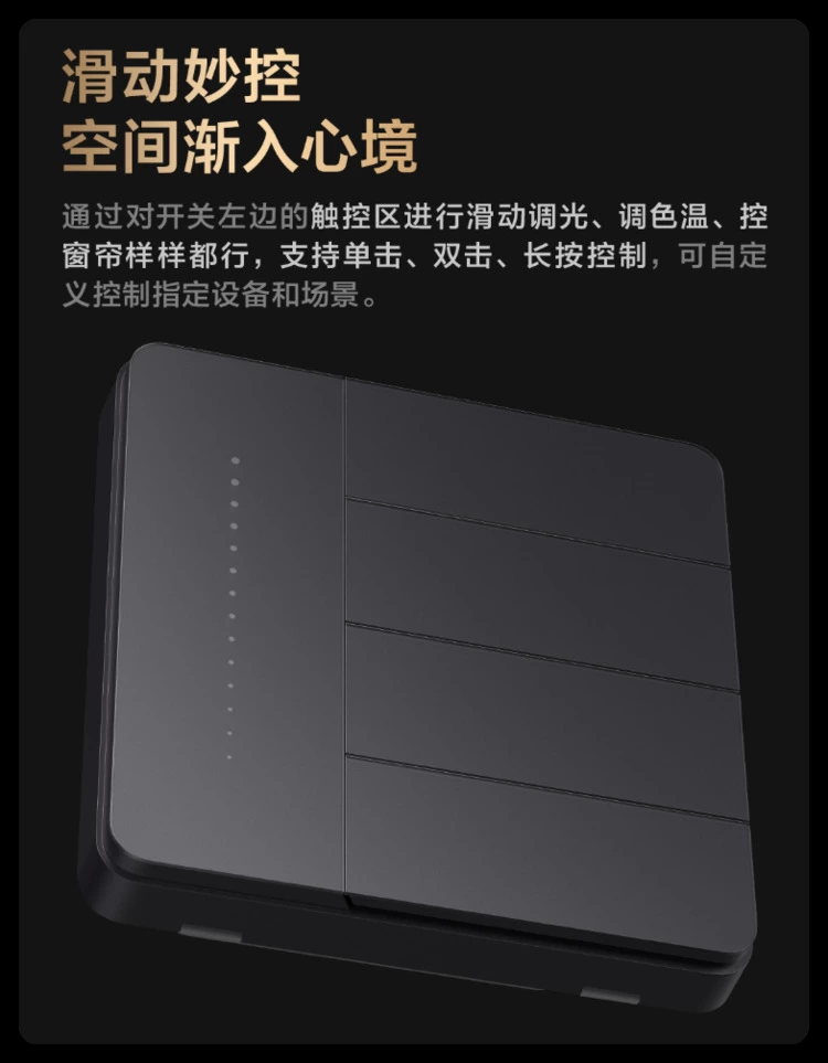 Aqara卡农 智能墙壁开关 Z1 Pro采用滑动妙控设计,通过对开关左边的触控区进行滑动调光、调色温、控制窗帘样样都行,并且支持单击、双击、长按控制,可自定义控制指定设备和场景。