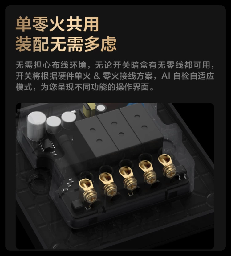 Aqara卡农 智能墙壁开关 Z1 Pro支持单零火共用设计,无需担心家里布线环境,只要考虑键位,根据硬件的单火/零火接线方案,通过AI自检自适应模式,就能呈现不同的界面。