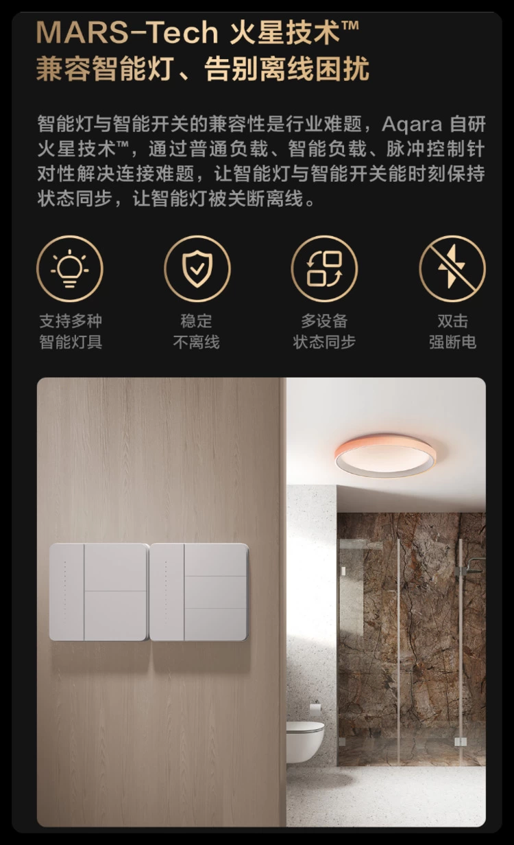 智能灯与智能开关的兼容一致都是行业性的难题,Aqara自研火星技术,通过普通负载、智能负载、脉冲控制针对性解决连接问题,让智能灯与智能开关可以时刻保持状态同步