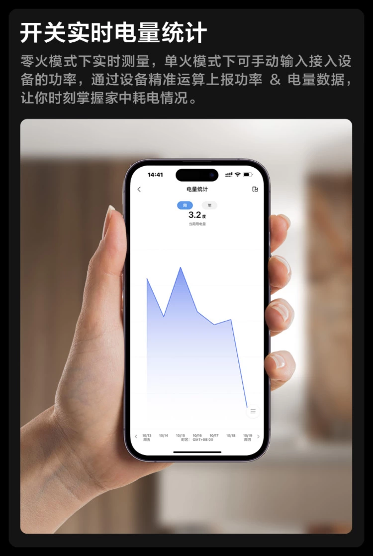 Aqara卡农 智能墙壁开关 Z1 Pro配备了实时电量统计,无论是零火模式还是单火模式,你都可以时刻掌握家中耗电情况