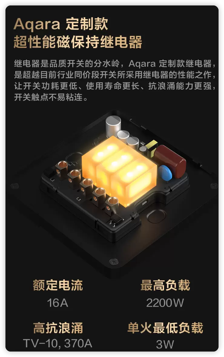 Aqara卡农 智能墙壁开关 Z1 Pro采用了超性能磁保持继电器,让开关功耗更低、使用寿命更长、抗浪涌能力更强。