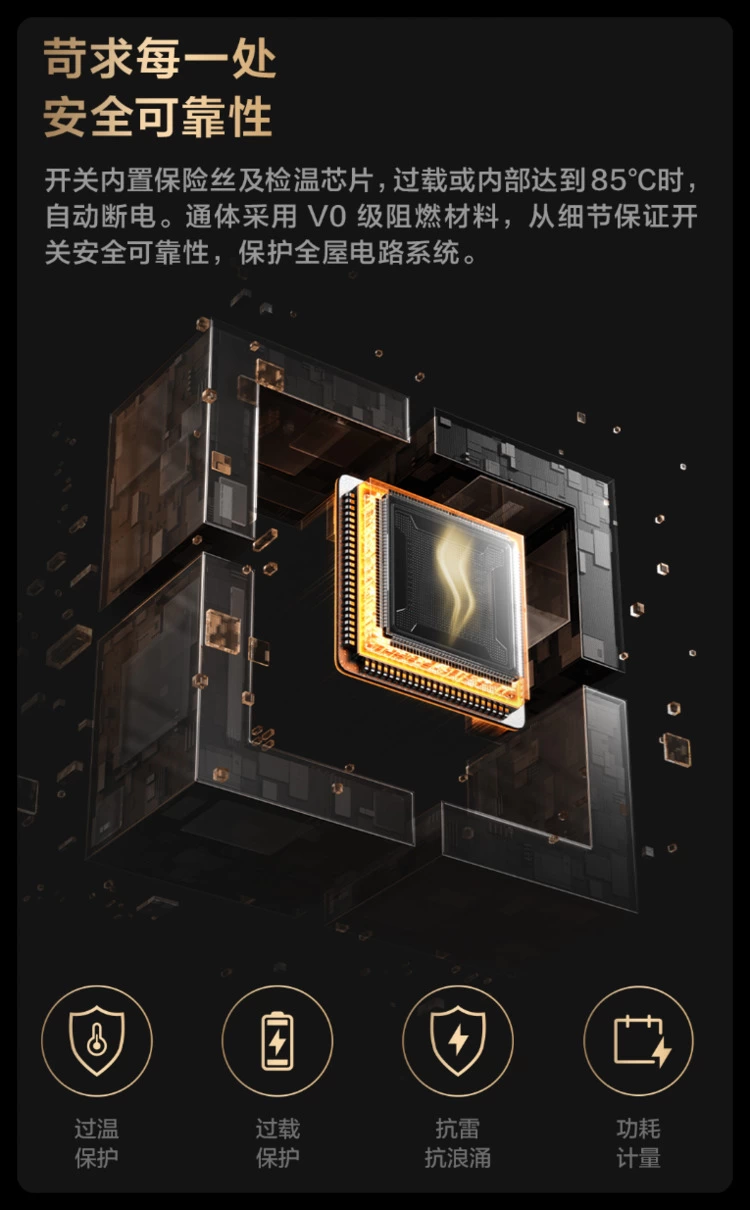通体采用了V0级的防火阻燃材质,黄铜镀金接线端子,同时还配备了内置保险丝和检温芯片,当开关过载或者温度达到85°C自动断电。