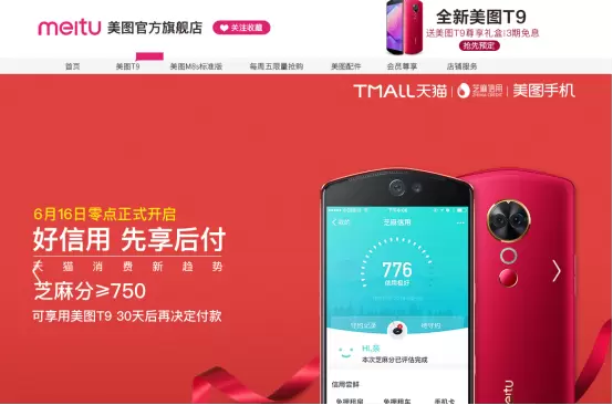 2018年6月,美图手机推出了全新的美图T9,由天猫美图旗舰店独家首发。美图手机联合阿里旗下天猫及芝麻信用联合推出美图T9手机“先享后付”活动,支付宝芝麻信用分达到750及以上的用户,即可于活动期间在天猫美图旗舰店申请体验新品美图T9“先享后付”服务,30天的体验周期内,如果用户满意可选择付款购买拥有美图T9,如不满意则可以直接退货。