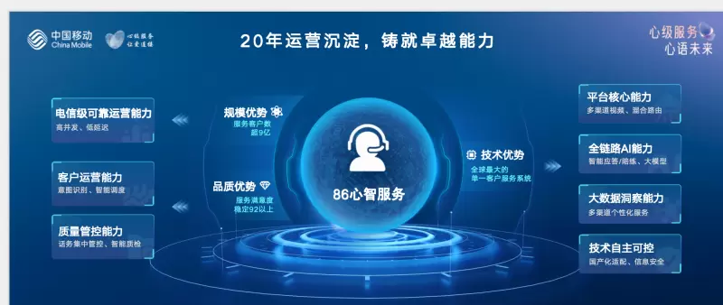 经过20多年的运营建设,10086已成为全球最大的一体化客户服务系统,沉淀出电信级可靠的运营能力、质量管控能力、平台能力、全链路AI能力、大数据洞察能力,技术自主可控,并且完成了国产化适配,为中国移动打造值得信赖的服务品牌奠定技术积淀。