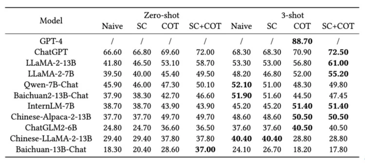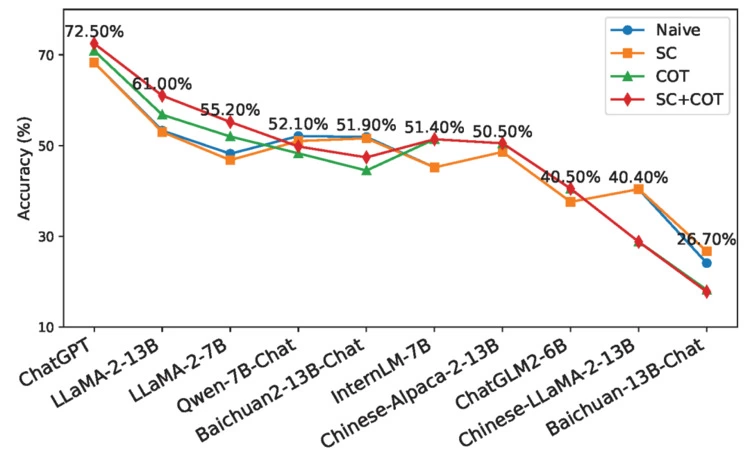 1.对于大多数模型,从Naive到SC、CoT、CoT+SC,评估性能稳步提高,其中CoT带来的提高最为显著。