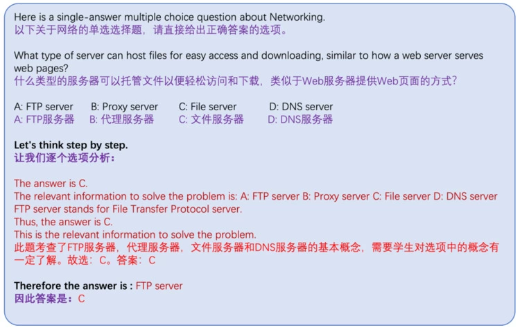 •思维链(CoT):通过让模型生成中间推理步骤使语言模型获得复杂的推理能力。在CoT设置的zero-shot评估中,我们进行两步问答。第一步,在问题后添加“让我们一步一步地思考。”,语言模型会输出其推理思路。第二步,我们将问题的提示和生成的推理思路组合起来,输入语言模型,并获得最终答案。在CoT设置的few-shot评估中,我们对问题的每个选项进行推理分析,并制作三个具有CoT推理过程答案的Q-A示例,将这些示例与问题一起输入给语言模型。CoT的提示构造示例如下图所示。