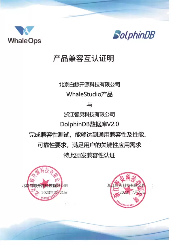 作为上榜 Gartner 实时数据管理代表服务商的企业,DolphinDB 有着运行高效、使用便捷的流数据处理框架,支持流数据的发布、订阅、预处理、实时内存计算,以及复杂指标的滚动窗口计算、滑动窗口计算、累计窗口计算等。将 DolphinDB 与白鲸开源 WhaleStudio 新一代数据集成调度工具结合,可以帮助企业更好地适应大数据和云原生大时代下的数据处理与治理需求。双方投入研发力量,完成了两套系统的对接开发、功能验证以及兼容性、可靠性测试。测试结果显示,DolphinDB 数据库与 WhaleStudio 产品已完成兼容性测试,能够达到通用兼容性及性能、可靠性要求,满足用户的关键性应用需求。