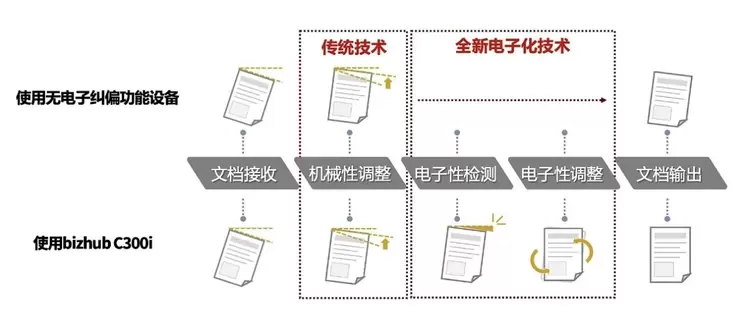 此外,bizhub C300i在原有的机械纠偏功能之上,还全新增加了电子纠偏功能,可通过全新的电子化技术,自动检测当前文稿并及时进行调整,从而保证文档的高品质输出。