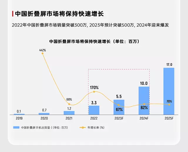 根据Counterpoint统计,2022年中国折叠屏手机市场销量突破300万台,同比增长170%,预计2023年还将增长67%到550万台。该机构还预测,中国折叠屏手机市场销量在2025年有望突破1700万台。