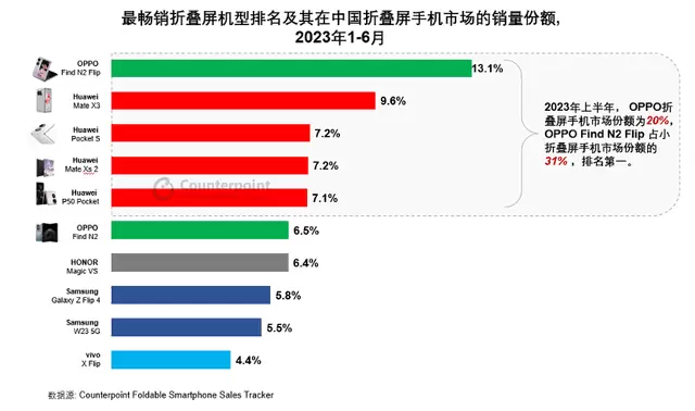 Counterpoint的另一组数据显示,2023上半年OPPO折叠屏手机市场份额为20%,OPPO Find N2 Flip以31%的市场占有率主导竖向折叠市场,是中国市场最受欢迎的折叠手机。