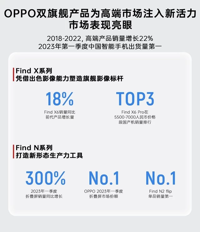 根据IDC数据显示,2023年上半年,OPPO成功跻身国内600美元以上手机市场份额前三,仅次于苹果、华为。值得注意的是,也正是在去年年末,OPPO同时推出了大小折叠旗舰,这在一定程度上对OPPO在高端市场的发展,起到了积极作用。