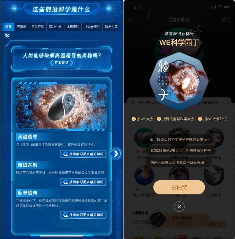 除了学习了解本届的大会内容,用户还可搜索“WE大会”或相关的科学关键词,在搜索专题页中,浏览自2011年起,十多年来在历届腾讯科学WE大会上,发布过的突破性科学发现。而知识储备丰富的用户,也可通过问答互动,更加深入地学习科学知识,获得“WE科学园丁”勋章,在QQ浏览器上“种”下科学的种子,深度参与到大会中来。