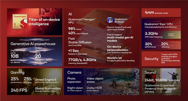 更值得关注的是,第三代骁龙8将生成式人工智能功能直接引入芯片组,加快了密集型计算,支持将人工智能大模型植入手机。