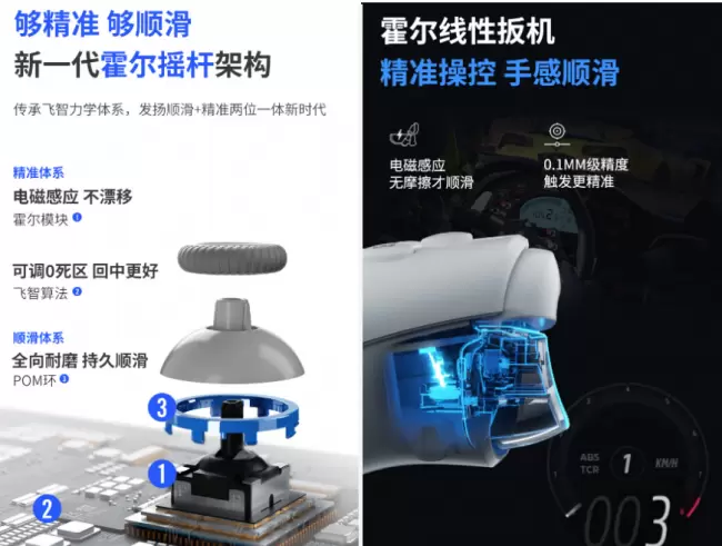 飞智冰原狼2游戏手柄最具亮点的是以“双霍尔”体系为核心的精英手柄功能的下放,进一步满足玩家对游戏进阶操作的要求:冰原狼1一直大受好评的霍尔线性扳机在冰原狼2中得到了升级——手感更为丝滑,255种线程变化在赛车游戏中保证扳机按多少、油门给多少,精准拿捏住每一场比赛,无往不利。另一方面,霍尔电磁摇杆代替了碳膜摇杆,减少了物理摩擦,真正做到了0死区、不漂移,自如来回,告别操作盲区;飞智自研的校正算法进一步确保游戏中的每个操作细节都能被精准识别,手感顺滑,在枪战游戏中助力玩家一击制敌、躲避险境。