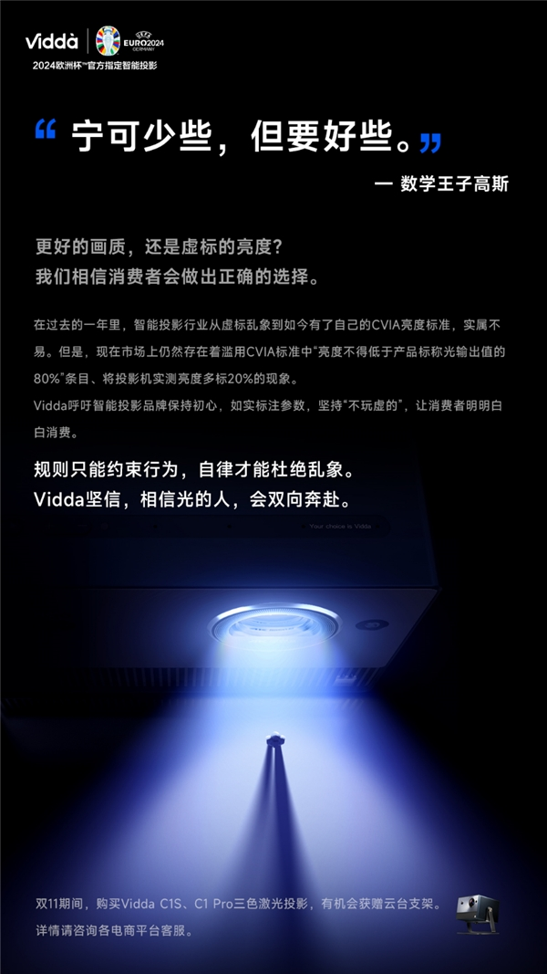 在海报中,Vidda指出了当前智能投影市场出现的一种“含糊”标注亮度的方式。即某些品牌滥用CVIA标准中“亮度不得低于产品标称光输出值的80%”条目,将实测出来的产品亮度参数再除以80%,并且作为核心参数进行宣传。这意味着,原本只有2000CVIA流明亮度的投影,可以堂而皇之的标注成2500CVIA流明宣传,而其中至少有20%的水分。普通消费者无法明白这种“含糊”标注的投影的真实亮度水平,很容易造成误解,导致吃了“哑巴亏”。