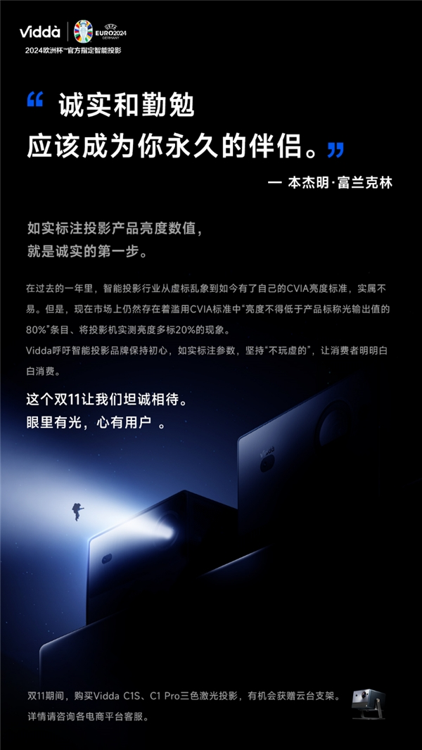 10月30日,Vidda官微发布海报,呼吁智能投影行业明确标注亮度,拒绝“含糊”,让消费者过一个更加安心、明明白白消费的双11。据了解,作为智能投影行业第一个喊出“不虚标”的品牌,Vidda不仅在行业内率先标注实测亮度参数,而且推出了全球首款4K三色激光投影,将家用智能投影的画质提上了全新高度。