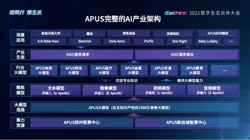 现场,邓小波深入讲解了APUS大模型的产业架构,以及APUS在AI产业链上的关键布局。他介绍,目前APUS已在河南郑州和新加坡建立了两大的算力中心,支持APUS大模型自身研发和应用创造的同时,也向伙伴、开发者开放算力服务。今年4月份,APUS率先发布了千亿级多模态大模型,并推出视频、音频、文本、图片等精炼模型,均已面向产业各界进行开放。