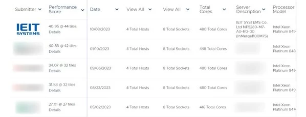 在此次VMmark 3基准测试中,浪潮信息使用4节点inMerge1100超融合集群,部署了44个Tile,共计836个虚拟机,最终以40.95分打破测试纪录,同时Tile数量相比第二名提高了5%,无论是虚拟机数量还是虚拟机性能,都位于参测厂商之首。