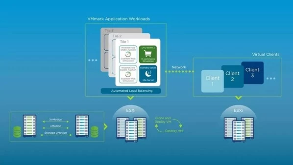 VMmark是VMware公司推出的业界权威的衡量虚拟化性能的测试工具。该测试实现了对企业基础信息化系统的高仿真模拟,创新性地引入了"片状单元 (tile) "的概念,每个片状单元涵盖文件、邮件、Web等六种常见的业务系统,各业务系统的压力和参数设置根据实际情况有严格的设定。通过片状单元的加载测算出每台服务器所能承载的虚拟机数量及单个虚拟机的运算性能,得出测试成绩。简而言之,测试成绩反映了两个方面的指标:一是在确保性能要求的情况下,测试平台最大可以承载多少个仿真企业的信息化系统的片状单元,即量的指标;二是在承载片状单元相同的情况下,测试平台的性能表现,即质的指标。这对于虚拟化用户选择服务器硬件和部署方案都具有很高的实际参考价值。