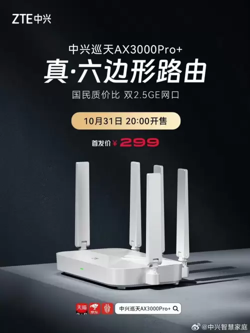 10月30日消息,中兴新款路由器中兴巡天AX3000Pro+将于10月31日20:00正式开售,当前可在天猫、京东及红魔商城进行预约,首发价格299元。
