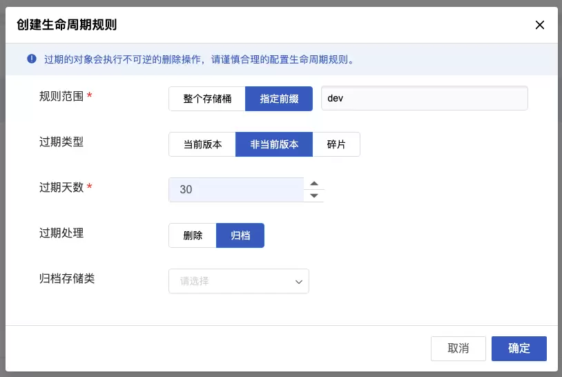新版本中,UCloudStor面向对象存储的生命周期管理能力得到进一步增强,通过设定生命周期规则,实现指定范围数据的自动化归档上云,针对需要长期保存、不经常访问的数据提供了一种经济高效的管理方法,将数据从主要的在线存储层迁移到冷归档存储,在降低成本的同时,保持数据的可访问性和持久性。